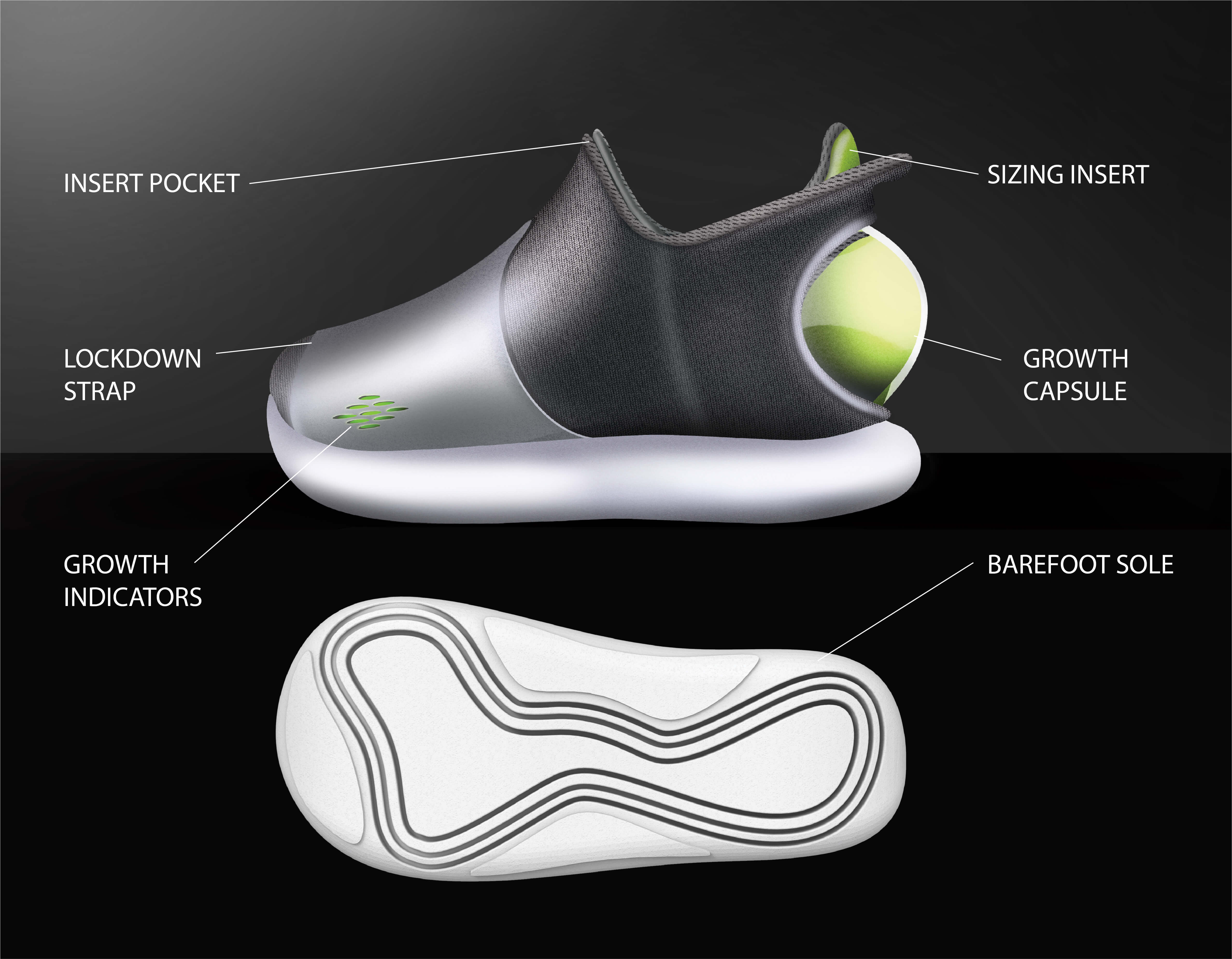 A sneaker designed for kids that grows up to one size with them. A sustainable option to limit production and consumption of shoes for kids in an age group with rapid foot growth.